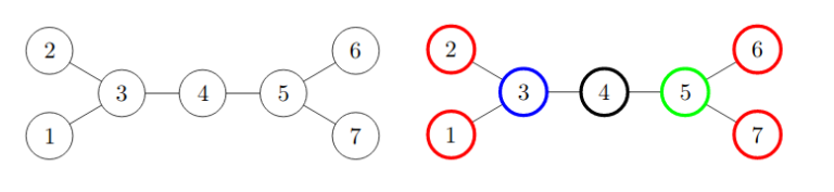 下图展示了第一个和第二个样例中步行区的结构。第二张图还展示了 $k=4$ 时的一种可能的颜色分配方案。