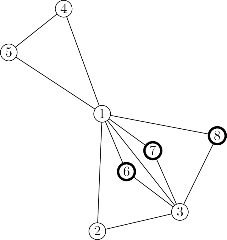 下图展示了样例测试中的第三个方案。Crook 可以偷走的顶点集合用粗体表示。