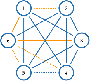 下图为第一个样例的图。虚线表示权值为 $0$ 的边,其他边权值为 $1$。其中一个最小生成树用橙色高亮,总权值为 $2$。