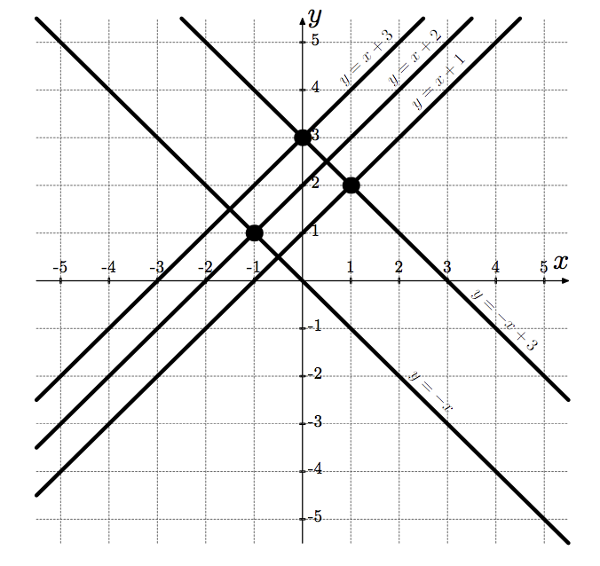 下图展示了样例第一个测试用例中的直线。黑色圆点表示坐标均为整数的交点。