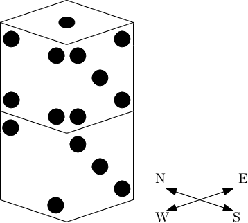 For example, the number of visible pips on the tower below is $ 29 $ — the number visible on the top is $ 1 $ , from the south $ 5 $ and $ 3 $ , from the west $ 4 $ and $ 2 $ , from the north $ 2 $ and $ 4 $ and from the east $ 3 $ and $ 5 $ .