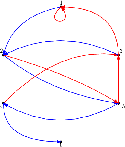 有一个有向图,包含 $n$ 个顶点,编号为 $1$ 到 $n$,其中每个顶点(除了 $n$ 号顶点)都有两条出边,分别为红色和蓝色。任意时刻,每个顶点恰好有一条出边处于激活状态。初始时,所有蓝色边处于激活状态,并且有一个标记位于顶点 $1$。每经过一秒,标记所在的顶点会首先切换其激活的出边——未激活的边变为激活,原本激活的边变为未激活。然后,标记沿着当前激活的出边移动。当标记到达顶点 $n$ 时,过程停止。保证从任意顶点都可以通过若干条边到达顶点 $n$。