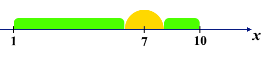 Polycarp 从 $1$ 走到 $10$。黄色区域表示以 $7$ 为中心、半径为 $1$ 的基站覆盖区。绿色区域表示 Polycarp 不在覆盖区的部分路径。