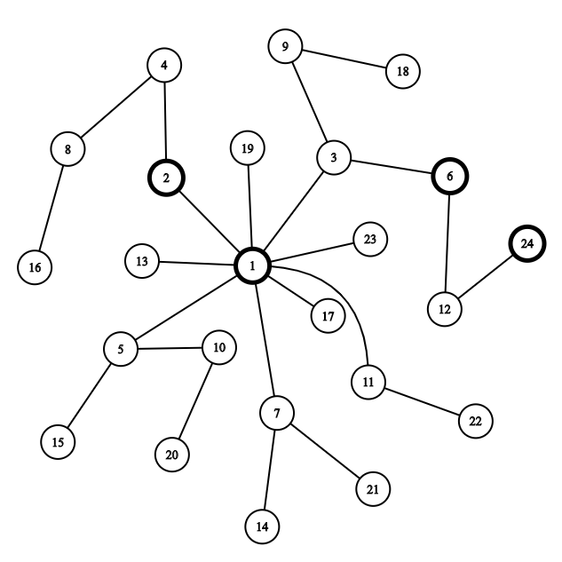 Considering the first $ 24 $ nodes of the system, the node network will look as follows (the nodes $ 1! $ , $ 2! $ , $ 3! $ , $ 4! $ are drawn bold):