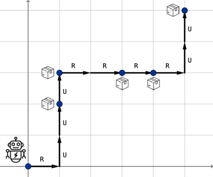 机器人有些损坏,只能向上('U')和向右('R')移动。也就是说,每次移动,机器人可以从点 $(x, y)$ 移动到 $(x+1, y)$ 或 $(x, y+1)$。