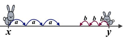例如,假设 $x=0$,$y=10$,$a=2$,$b=3$。在第 $1$ 秒时,两只兔子分别在位置 $2$ 和 $7$。在第 $2$ 秒时,两只兔子都在位置 $4$。