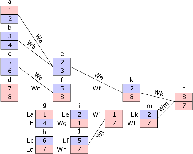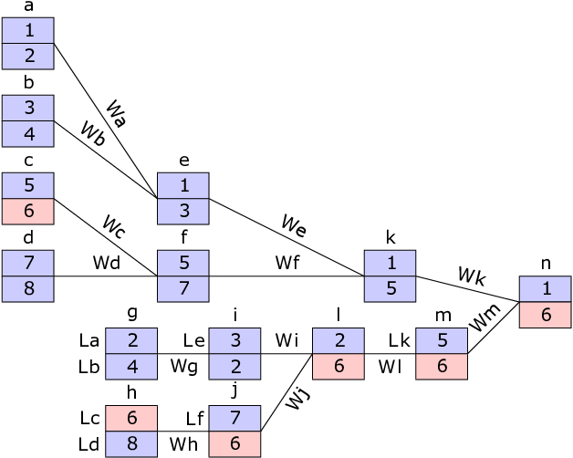 在下图中,锦标赛的每场比赛用英文字母($a$ 到 $n$)表示。第 $i$ 场比赛的胜者记为 $Wi$,败者记为 $Li$。你喜欢的队伍用红色高亮显示。