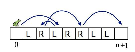 有一只青蛙停留在字符串 $s = s_1 s_2 \ldots s_n$ 的左侧(更准确地说,青蛙最初位于第 $0$ 号格子)。字符串 $s$ 由 $n$ 个字符组成,每个字符都是 'L' 或 'R'。这意味着,如果青蛙停在第 $i$ 个格子且第 $i$ 个字符为 'L',青蛙只能向左跳;如果青蛙停在第 $i$ 个格子且第 $i$ 个字符为 'R',青蛙只能向右跳。青蛙只能从第 $0$ 号格子向右跳。