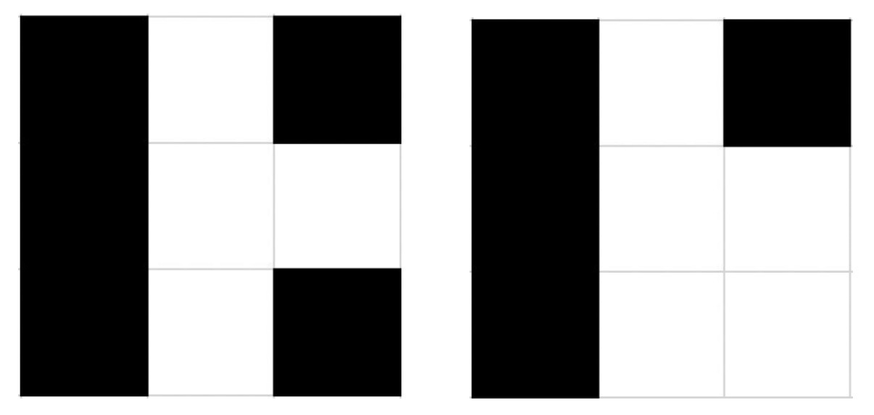 下图中的第一种上色方式有 $B=5$,$W=4$(所有格子都有至少一个相邻的异色格子)。而第二种上色方式不是“好”的,因为它有 $B=4$,$W=4$(只有右下角的格子没有相邻的异色格子)。