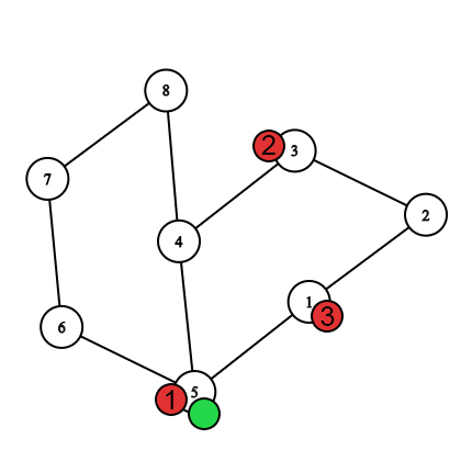 Let Nastya be a green chip, and three numbered red ones are three bees. In the first test, the movement of the heroes looks like this. ![](https://cdn.luogu.com.cn/upload/vjudge_pic/CF1340E/eebe866e106b15cd4f913c73aaf260bbec89b0be.png)After selecting the starting vertices. ![](https://cdn.luogu.com.cn/upload/vjudge_pic/CF1340E/8e4e6f78156a91462d830df3504b2ef8c1505235.png)The first move after the bees move. ![](https://cdn.luogu.com.cn/upload/vjudge_pic/CF1340E/6d0f4b630ba495400de16f076bf674029933c110.png)The first move after the Nastya's move. The first bee caught Nastya. In the second test, the movement of the heroes looks like this. ![](https://cdn.luogu.com.cn/upload/vjudge_pic/CF1340E/7707616cf81fb714e43eeb2a6362c5e8a3bf262d.png)After selecting the starting vertices. ![](https://cdn.luogu.com.cn/upload/vjudge_pic/CF1340E/8dea8ee189ace3b1c8235989507a75ea207a8216.png)The first move after the bees move. ![](https://cdn.luogu.com.cn/upload/vjudge_pic/CF1340E/1ab4509e500fa9da800c357b644de765dad19bf7.png)The first move after the Nastya's move. ![](https://cdn.luogu.com.cn/upload/vjudge_pic/CF1340E/6c5bc353d2e63e835158afd78f85a506ae7b7d9f.png)The second move after the bees move. The first bee caught Nastya.