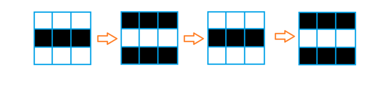 ![](https://cdn.luogu.com.cn/upload/vjudge_pic/CF1349C/4db31c297e8a6314da42c884c8f60724b3ebcd9e.png) 对于第一个样例,上图展示了初始状态以及第 $1$、$2$、$3$ 轮时各格子的颜色。可以看到,第 $1$ 行第 $1$ 列在第 $1$ 轮时是黑色,第 $2$ 行第 $2$ 列在第 $2$ 轮时是黑色,第 $3$ 行第 $3$ 列在第 $3$ 轮时也是黑色。 对于第二个样例,你可以证明所有格子的颜色都不会发生变化。 由 ChatGPT 4.1 翻译