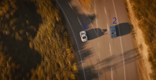 最快相撞的是第 $2$ 辆车和第 $4$ 辆车。可以在 $0$ 时刻启动第 $2$ 辆车,在约 $0.096762$ 时刻启动第 $4$ 辆车,其余两辆车在任意时刻启动。这样,第 $2$ 辆车和第 $4$ 辆车将在约 $0.585902$ 时刻相撞。下图为碰撞瞬间的示意:
