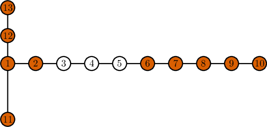 第三个样例的最优方案如图所示。只有基地 $3$、$4$、$5$ 被破坏,未被破坏的基地同样以橙色标记。