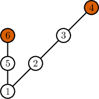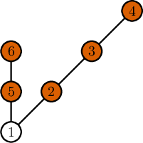 下图展示了第二个样例的最优方案。未被破坏的基地为 $2$、$3$、$4$、$5$、$6$(橙色标记)。