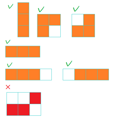 她希望所有被涂色的单元格都是相邻的。也就是说,对于任意两个被涂色的单元格,应该存在一条仅经过被涂色单元格的路径,使得路径上的任意两个相邻单元格都是边相连的。