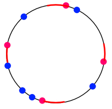 上图为客运电车运行的正确方式示意图。此处 $h=2$(因此客运电车数量为 $2h=4$),货运列车数量为 $n=6$。客运电车用红色标记(注意它们之间的间隔相同)。货运列车用蓝色标记。每班客运电车前的长度为 $k$ 的时间段用红色高亮。注意这些时间段内没有货运列车。不幸的是,可能无法在不取消部分货运列车的情况下满足政府的要求。请帮助政府找到最优的 $t$ 值,使得在所有客运电车按计划发车的情况下,需要取消的货运列车数量最少。