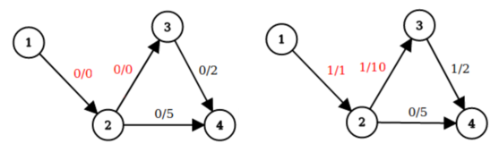 For the second sample, the following images correspond to the first two queries (from left to right respectively). For each edge there is a pair flow/capacity denoting flow pushed through the edge and edge's capacity. The special edges are colored in red.