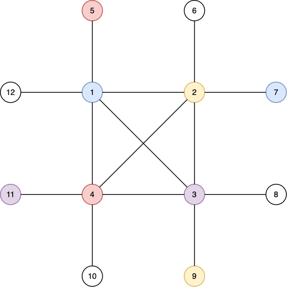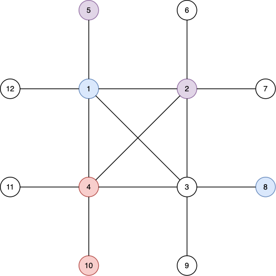 如果对于任意两对配对 $(a, b)$ 和 $(c, d)$,由这四个节点 $\{a, b, c, d\}$ 构成的诱导子图中,最多只有 $2$ 条边(在 $6$ 条可能的边中),则称该配对是合法的。