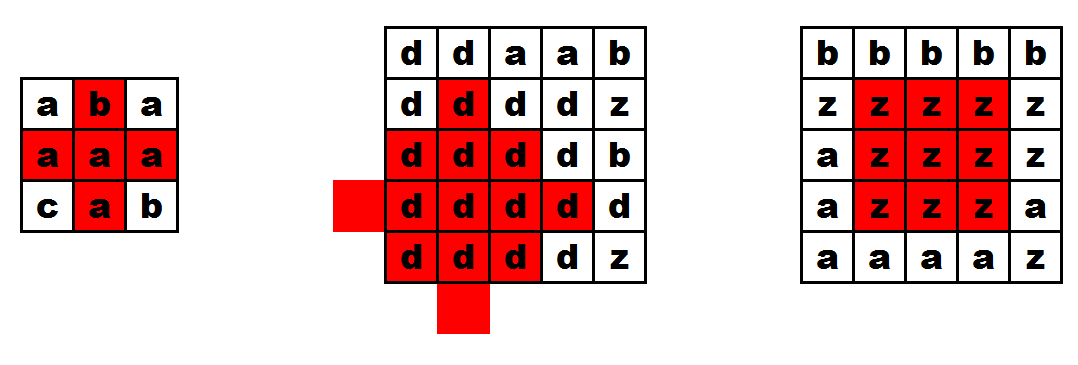 第一行包含两个整数 $n$ 和 $m$($1 \leq n, m \leq 2000$)。接下来的 $n$ 行,每行包含 $m$ 个小写英文字母,第 $j$ 个字母表示当前行第 $j$ 列的布片。相同字母表示相同颜色,不同字母表示不同颜色。