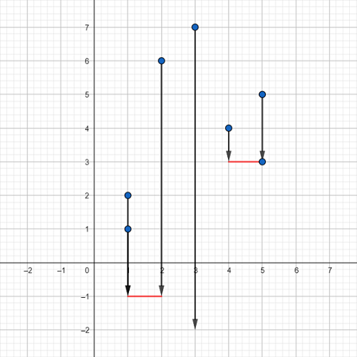 蓝色点表示给定的点,红色线段表示平台。其中一种可行的放置方式是将第一块平台放在点 $(1, -1)$ 和 $(2, -1)$ 之间,第二块平台放在点 $(4, 3)$ 和 $(5, 3)$ 之间。箭头表示点的下落轨迹。可以看到,只有点 $(3, 7)$ 无法被拯救,会一直下落而丢失。可以证明这是最优方案。另外,点 $(5, 3)$ 已经在平台上,因此不会下落。