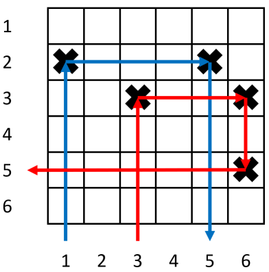 在上图中,$n=6$,黑色叉号表示靶子。第 $1$ 列的回旋镖(蓝色箭头)弹跳了 $2$ 次,第 $3$ 列的回旋镖(红色箭头)弹跳了 $3$ 次。
