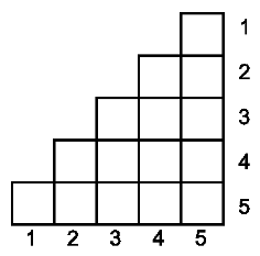 一个方阵的副对角线是指从右上角到左下角的一条对角线。我们定义 $n$ 级“楼梯”为一个 $n×n$ 的方阵,其中副对角线上方没有方格(如下图所示为 $5$ 级楼梯)。