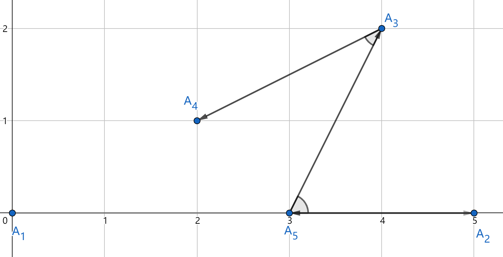 请注意,$A_1$、$A_2$ 和 $A_5$ 以 $A_2$ 为顶点的夹角被视为 $0$ 度,而 $A_1$、$A_5$ 和 $A_2$ 以 $A_5$ 为顶点的夹角被视为 $180$ 度。