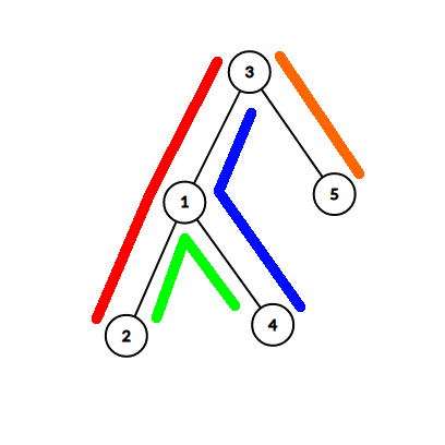 第一组样例中的树和路径如上图所示。路径对 $(1,4)$ 和 $(3,4)$ 恰好在一个顶点处相交。