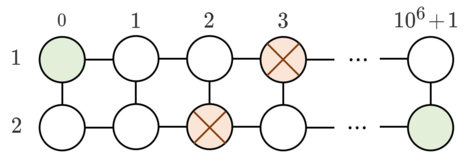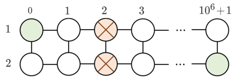 给你一个 $n$ 行 $10^6+2$ 列的图,行从 $1$ 到 $n$ 标号,列从 $0$ 到 $10^6+1$ 标号。