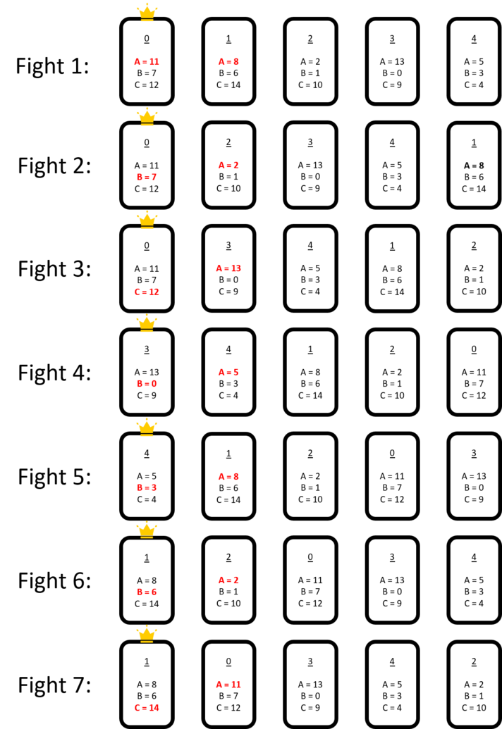 The following describes the sequence of events for the second sample. Note that in fight $ 1 $ , the king (animal $ 0 $ ) has strength $ A_0 $ . The tournament ends at fight $ 7 $ as animal $ 1 $ wins fight $ 5 $ , $ 6 $ and $ 7 $ .