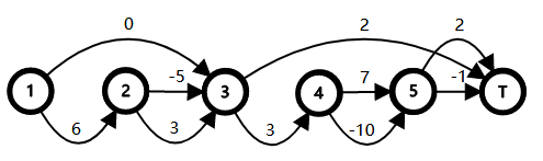 在第一个测试的第一轮,必须经过的集合为 $\{1\}$。可行路径为 $1\to 3\to T$,总代价为 $6$。