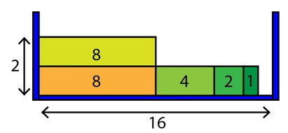 在上图中,每个矩形内的数字表示其宽度。二维盒子的宽度为 $16$(下方箭头所示)。在这种情况下,二维盒子的最小高度为 $2$(左侧所示)。