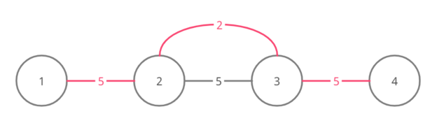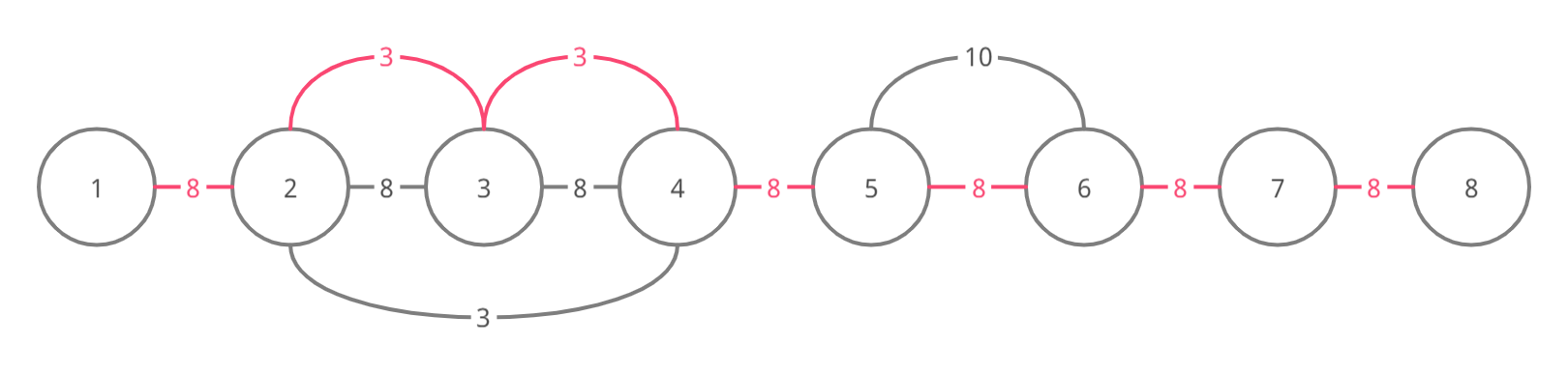 以下是样例的四个测试用例对应的图(可能的最小生成树的边用粉色标记):