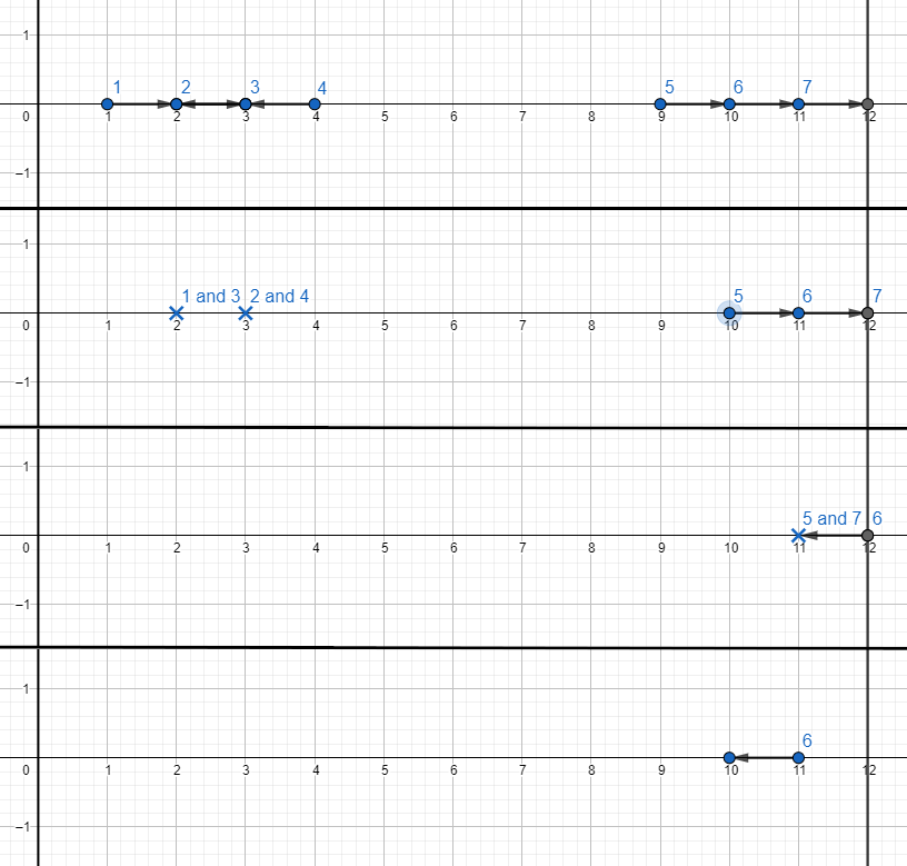 注意,机器人 $2$ 和 $3$ 不会发生碰撞,因为它们在 $2.5$ 这个非整数点相遇。