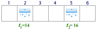 让我们来看一个例子。假设 $n=6, k=2$,第一台空调放在第 $a_1=2$ 个格子,温度为 $t_1=14$,第二台空调放在第 $a_2=5$ 个格子,温度为 $t_2=16$。此时各格子的温度如下: