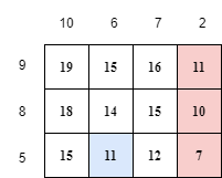 下图展示了第一个样例。每行左侧的数字表示 $a$ 列表,每列上方的数字表示 $b$ 列表。每个格子中的数字表示该格子的油漆层数。