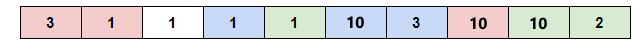 例如,考虑序列 $a=[3, 1, 1, 1, 1, 10, 3, 10, 10, 2]$ 和 $k=3$。下图展示了该序列的一种美妙涂色方案。