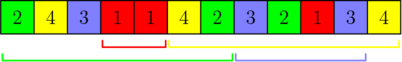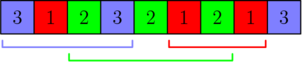 在第三个样例中,每个数字最多可以被包含在 $\left\lceil \frac{3}{3 - 1} \right\rceil = 2$ 个区间中。输出可以用下图表示: