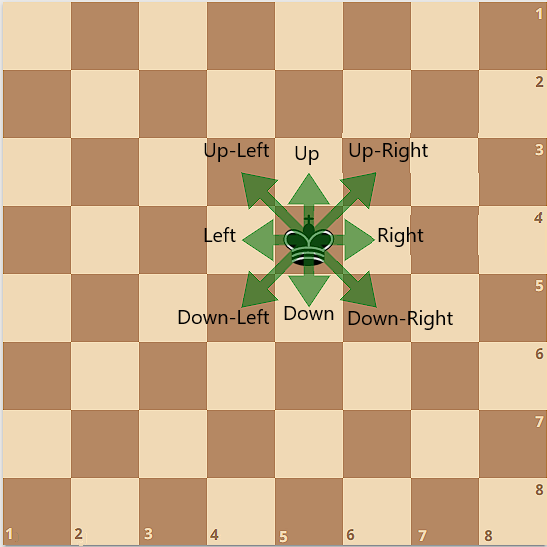 In one turn, the king can move "Right", "Left", "Up", "Down", "Down-Right", "Down-Left", "Up-Left", or "Up-Right" such that he doesn't get out of the board. The king cannot move into a cell that is on the same row, column or diagonal with the queen (including the position of the queen itself). For example, if the king was on square ( $ 4 $ , $ 5 $ ), he can move to ( $ 4+k_1 $ , $ 5+k_2 $ ) where ( $ -1 \le k_1,k_2 \le 1 $ , $ (k_1, k_2) \ne (0, 0) $ ).