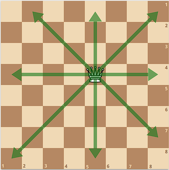 In one turn you can move the queen to any of the squares on the same horizontal line, vertical line, or any of the diagonals. For example, if the queen was on square ( $ 4 $ , $ 5 $ ), you can move to ( $ q_1 $ , $ 5 $ ), ( $ 4 $ , $ q_1 $ ), ( $ q_1 $ , $ 9-q_1 $ ), or ( $ q_2 $ , $ q_2+1 $ ) where ( $ 1 \le q_1 \le 8 $ , $ q_1 \ne 4 $ , $ 1 \le q_2 \le 7 $ , $ q_2 \ne 4 $ ). Note that the queen cannot stay on its current cell.