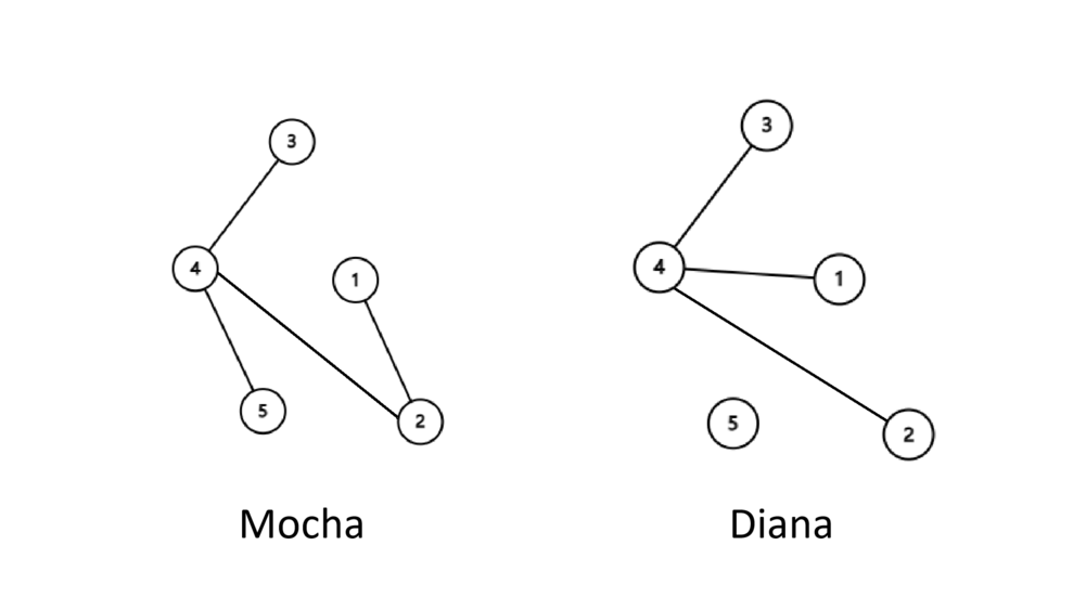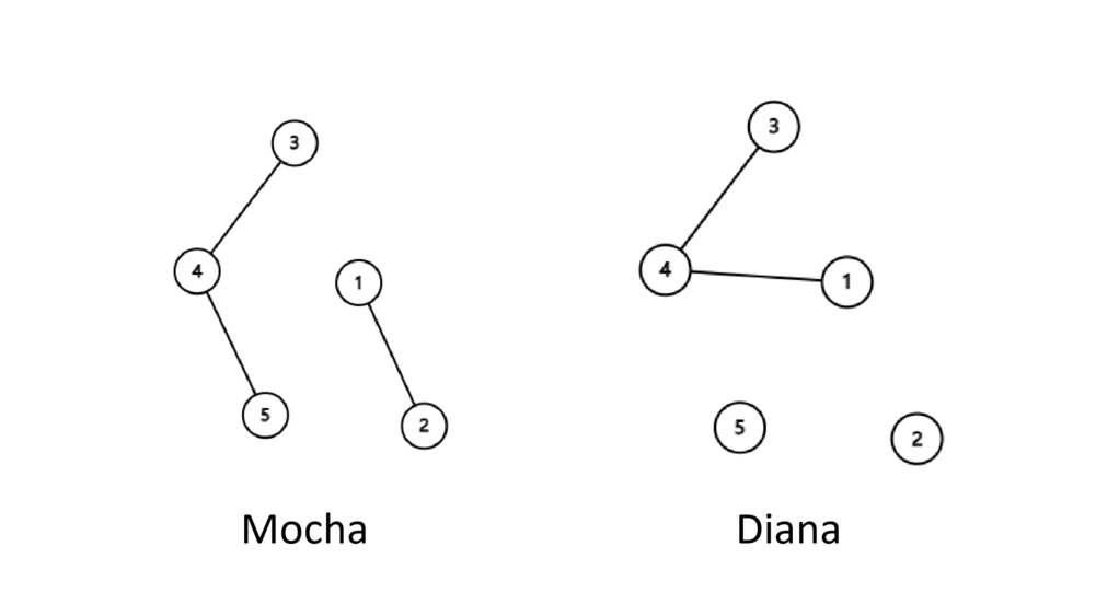 接下来 $m_2$ 行,每行两个整数 $u,v$ ( $1 \le u,v \le n, u \ne v$ ),用来描述第二个森林。