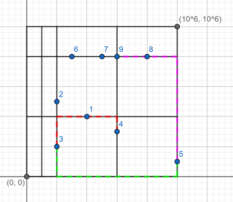 有一座城市可以表示为一个正方形网格,其顶点坐标为 $(0, 0)$ 和 $(10^6, 10^6)$。