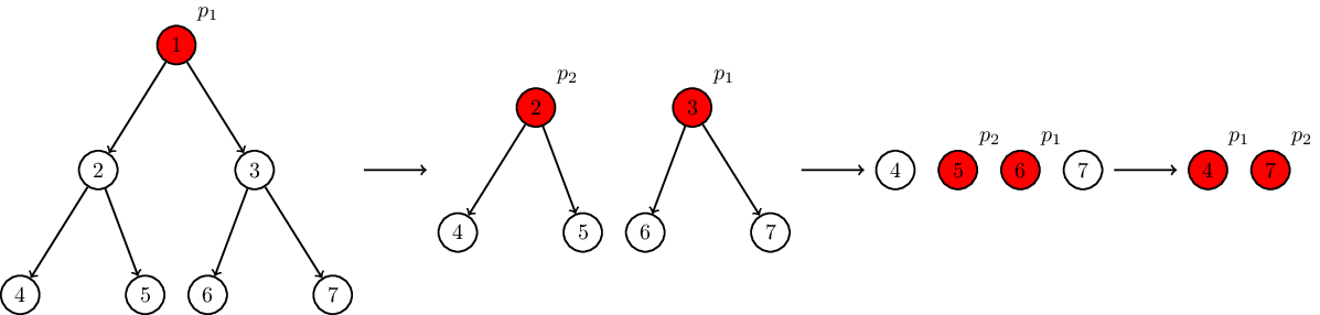 我们来看样例输入的第二个测试用例。有一棵高度为 $3$ 的满二叉树,有两个进程。第一时刻,只有一个就绪任务 $1$,$p_1$ 执行它。第二时刻,有两个就绪任务 $2$ 和 $3$,两个进程分别执行它们。第三时刻,有四个就绪任务 $4$、$5$、$6$ 和 $7$,$p_1$ 执行 $6$,$p_2$ 执行 $5$。第四时刻,有两个就绪任务 $4$ 和 $7$,两个进程分别执行它们。因此,系统共用 $4$ 个时刻完成所有任务。