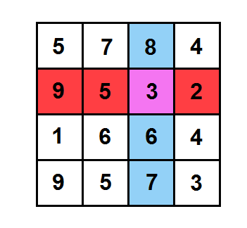 For instance, lets game was ended like is shown in the picture. Then the purple cell is winning, because the sum of its column numbers equals $ 8+3+6+7=24 $ , sum of its row numbers equals $ 9+5+3+2=19 $ , and $ 24>19 $ .