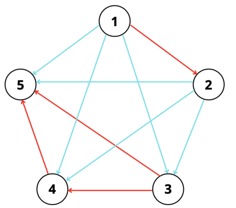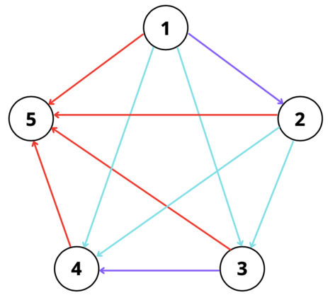 第一行输出 $c$,即满足上述要求所需的最少颜色数。 第二行输出一个长度为 $\frac{n(n-1)}{2}$ 的数组,表示每条边的颜色,颜色编号为 $1$ 到 $c$。构造中必须恰好使用 $c$ 种不同的颜色。输出顺序为:先按起点编号升序,再按终点编号升序。 例如,当 $n=4$ 时,边的顺序为:(1,2), (1,3), (1,4), (2,3), (2,4), (3,4)。