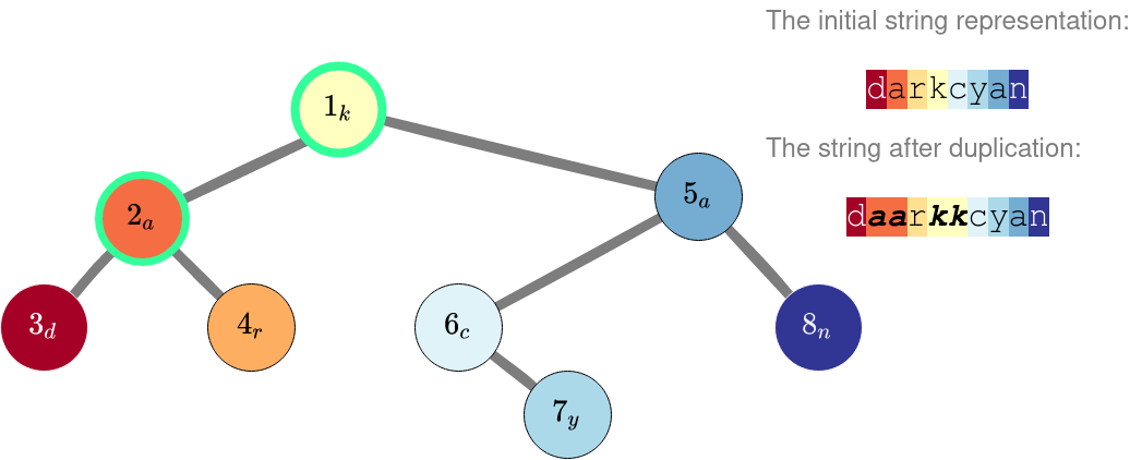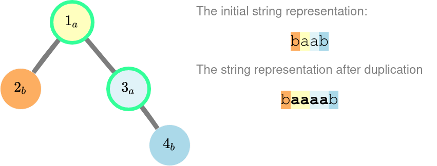 在第二个样例中,我们可以复制节点 $1$ 和 $2$ 的标签。注意,仅复制根节点的标签会得到比初始字符串更差的结果。