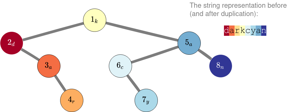 下图展示了样例的树结构。每个节点中的数字为节点编号,下标字母为其标签。右侧为树的字符串表示,每个字母颜色与对应节点一致。