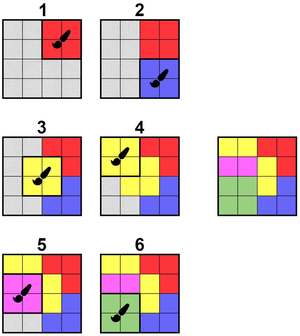 - 用颜色 $k$ 涂色 $(i, j)$、$(i + 1, j)$、$(i, j + 1)$、$(i + 1, j + 1)$ 这四个格子。