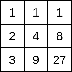 第 $i$ 行第 $j$ 列的格子中写着数字 $i^j$(即 $i$ 的 $j$ 次幂)。例如,当 $n=3$,$m=3$ 时,棋盘如下所示: