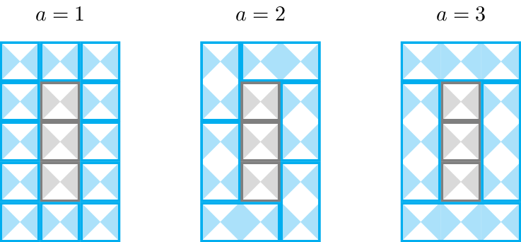 - 在地板的边缘,她计划使用尺寸为 $1 \times a$ 的长瓷砖,其中 $a$ 是一个正整数。这些瓷砖可以旋转 $90$ 度使用。